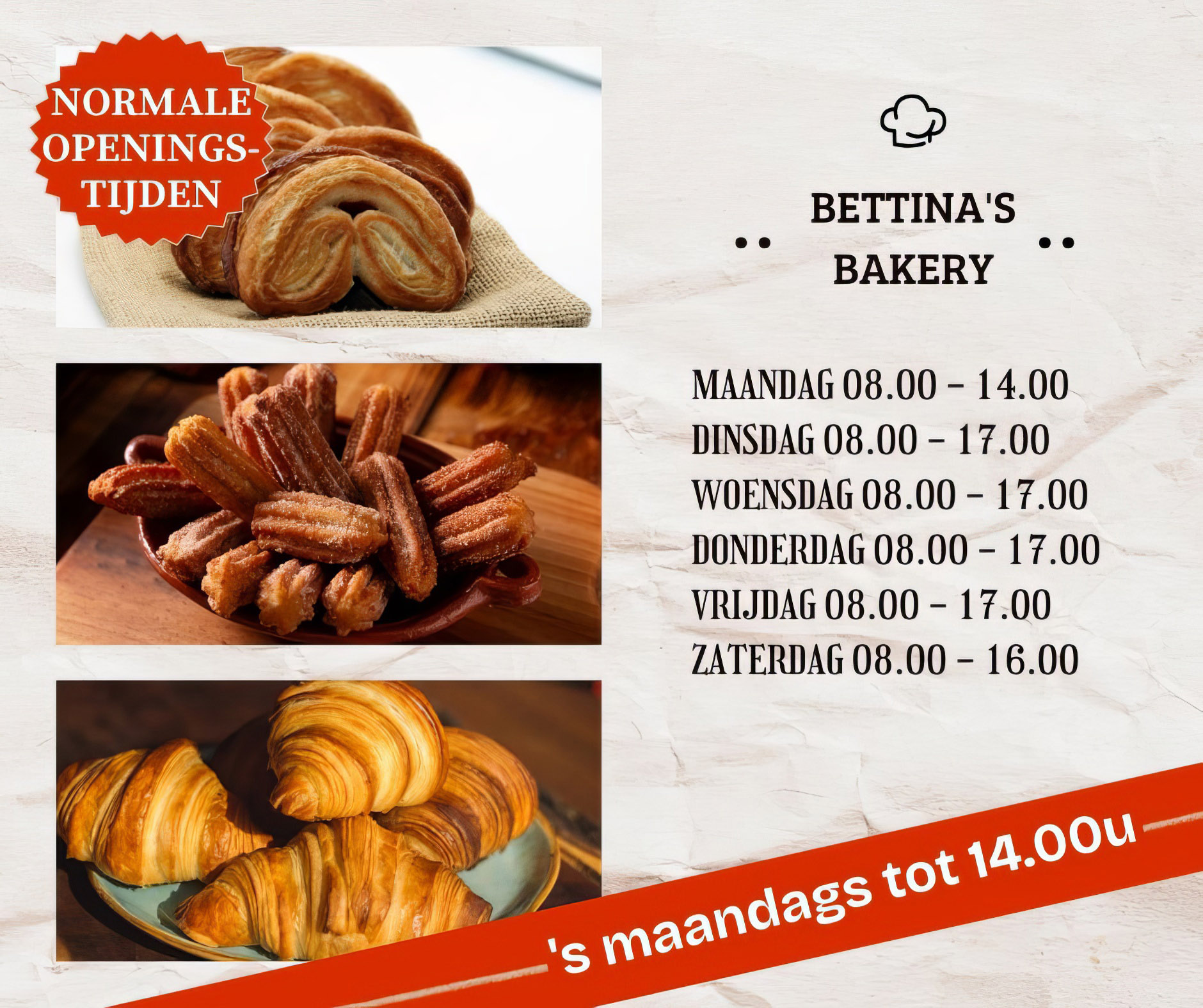 Diverse broodsoorten, belegde broodjes of half stokbrood naar keuze. Uiteraard alles dagvers. Ambachtelijke bonbons, gebak, vlaaien en natuurlijk Bettina's overheerlijke bekroonde vlaaien. Maar ook een ontbijtservice, een lunchservice, een bezorgservice en nog veel meer lekkers.